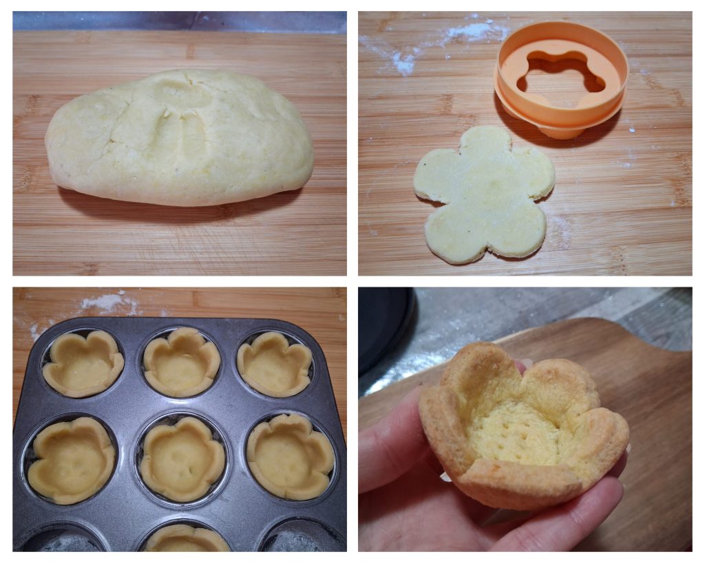 • Um diese leckeren herzhaften Törtchen herzustellen, muss der herzhafte Mürbeteig im Voraus zubereitet werden. Ich möchte euch vorschlagen, dass ihr alles von Hand kneten könnt, ich habe aber zur Bequemlichkeit die Küchenmaschine benutzt. In die Schüssel der Küchenmaschine das Mehl 00, das Salz, den geriebenen Parmesan, die kalte Butter aus dem Kühlschrank, in kleine Würfel geschnitten, und den schwarzen Pfeffer n.B. hinzufügen und mit dem Flachrührer, also dem K-Haken, bei Geschwindigkeit 2 für einige Minuten kneten, bis eine sandige Mischung entsteht. Schließlich das Ei und einen Schuss Milch hinzufügen und noch einige Minuten kneten, bis ein kompakter und homogener Teig entsteht. Den Mürbeteig gut zusammenpressen, in Frischhaltefolie wickeln und für 30 Minuten in den Kühlschrank legen. Den Mürbeteig aus dem Kühlschrank nehmen, etwas mit den Händen bearbeiten und auf einer bemehlten Arbeitsfläche mit einem Nudelholz zu einer 2-3 mm dicken Platte ausrollen und mit einer speziellen Ausstechform blumenförmige Scheiben ausstechen. Eine Muffinform einfetten und bemehlen und in jede Form das blumenförmige Stück legen. Mit der Rückseite des Nudelholzes den Mürbeteig so drücken, dass er perfekt in die Form passt. Den Boden mit einer Gabel einstechen und die Form für 40 Minuten in den Kühlschrank stellen. Nach der Ruhezeit im vorgeheizten statischen Ofen bei 180° für 20 Minuten oder bis zur goldenen Farbe backen. Ausschalten, herausnehmen und abkühlen lassen.