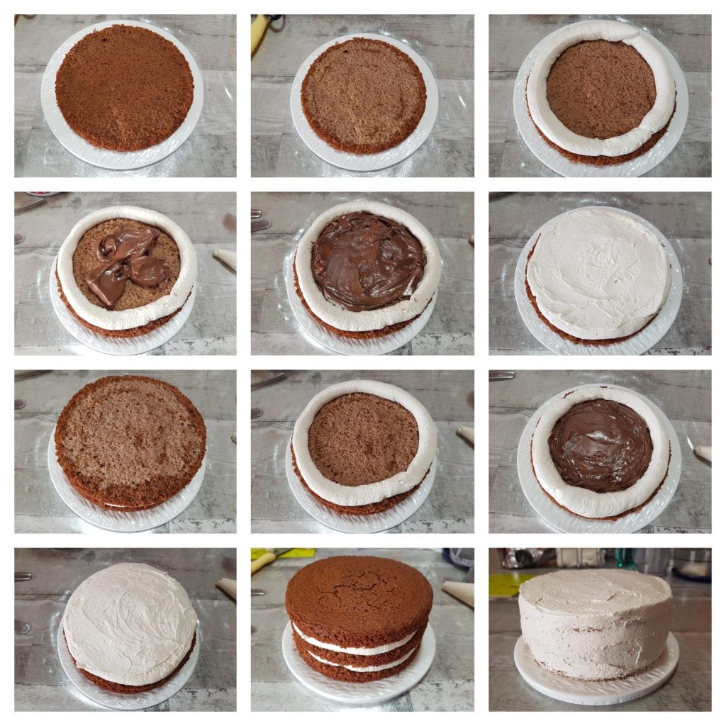 • Den Biskuit in 3 Scheiben schneiden. Den ersten Boden auf eine Servierplatte legen und mit einem Rand von Kaffee-Sahne füllen. In die Mitte Nutella geben und mit einer Schicht Kaffee-Sahne versiegeln. Mit dem zweiten Biskuitboden genauso verfahren und schließlich mit dem letzten Boden abschließen. Die gesamte Torte mit der restlichen Kaffee-Sahne einstreichen und 3-4 Stunden im Kühlschrank fest werden lassen. Die übrig gebliebene Füllung in den Kühlschrank stellen, da sie für die abschließende Dekoration benötigt wird.