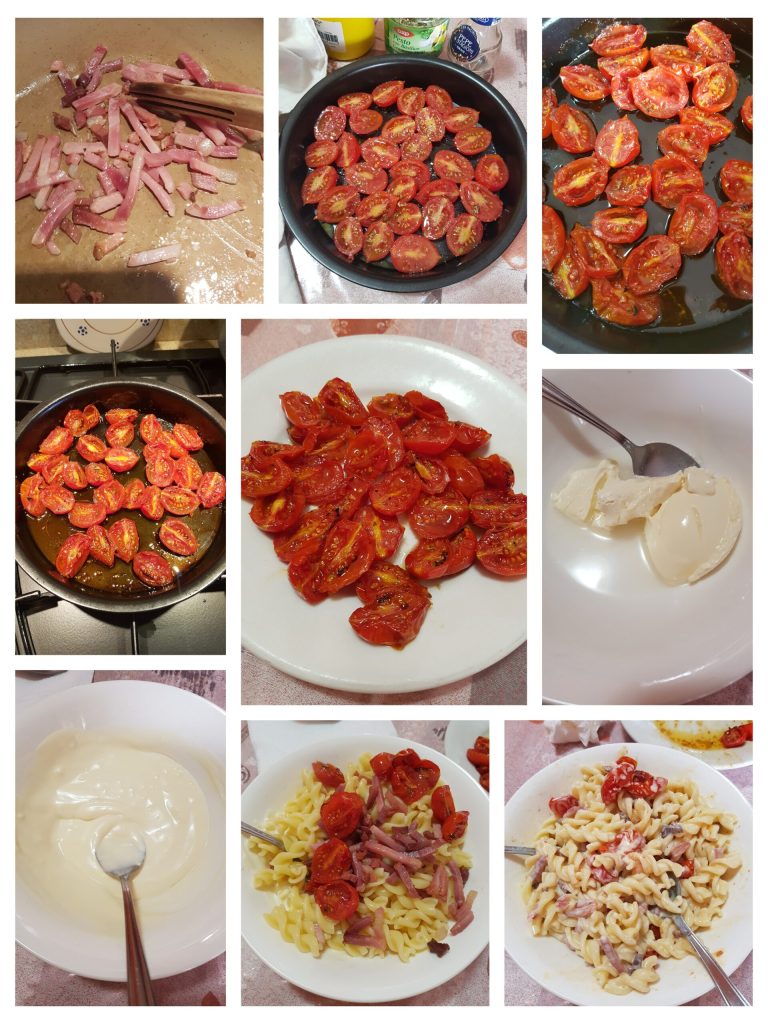 Um diesen cremigen kalten Nudelsalat mit Speck, Mascarpone und Ofentomaten zuzubereiten, müssen zuerst die Ofen-Tomaten zubereitet werden. Ich werde nicht das klassische Rezept für Confits machen, sondern die schnellere Version. Die Tomaten gut waschen und halbieren. Ein Backblech oder eine Form mit Backpapier auslegen und die Tomaten mit der Schnittfläche nach oben darauflegen. Auf jede Tomate etwas Olivenöl extra vergine, Salz und Zucker nach Geschmack geben und abschließend mit frischem oder getrocknetem Oregano bestreuen. Im vorgeheizten Umluftofen bei 200° etwa 10-15 Minuten backen oder bis sie etwas schrumpfen und bräunen oder rösten. Herausnehmen und abkühlen lassen. In der Zwischenzeit den Speck in einer Pfanne mit einem Schuss Öl einige Minuten anbraten und beiseitestellen, um abzukühlen. In einem Topf die Nudeln in gesalzenem Wasser kochen, ich habe Fusilli verwendet. Während die Nudeln kochen, den Mascarpone in eine große Schüssel geben und mit ein paar Löffeln Kochwasser zu einer Creme verarbeiten. Wenn die Nudeln dann gekocht sind, abgießen und in die Schüssel geben, in der wir den Mascarpone gelöst haben, und den Speck sowie die konfettähnlichen Tomaten dazugeben und alles gut vermengen.
