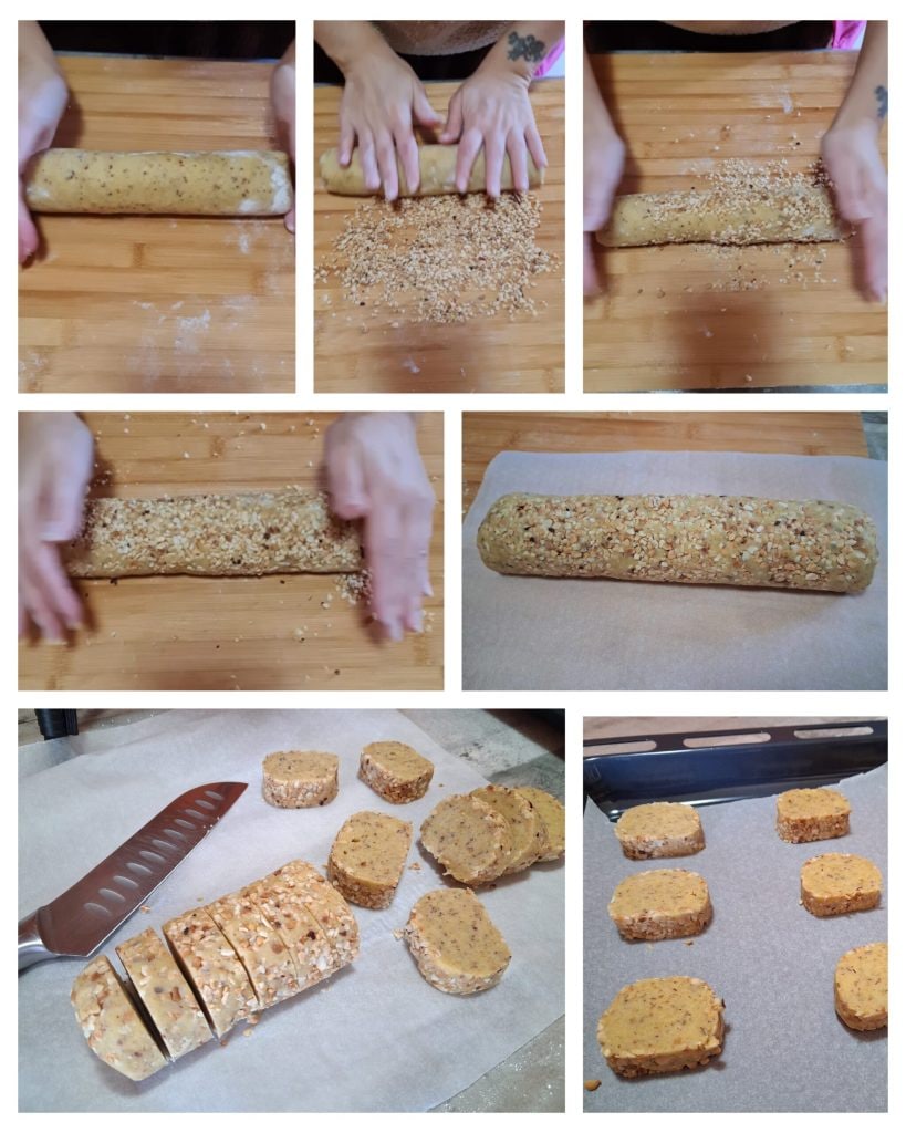 Wenn der Mürbeteig formbar und somit zu verarbeiten ist, einen etwa 6 cm dicken Teigstrang oder Zylinder herstellen. Den Krokant auf der Arbeitsfläche verteilen und den Zylinder darin wälzen, bei Bedarf den Zylinder mit etwas Wasser oder Eiweiß bestreichen, damit der Krokant besser haftet, ich habe das nicht benötigt. Wenn ihr einen schönen Zylinder habt, der vollständig mit Krokant bedeckt ist, auf ein Backpapier legen und im Gefrierfach fest werden lassen. Das dauert etwa eine Stunde. Wenn der Zylinder gefroren ist, mit einem Messer 1-2 cm dicke Kekse abschneiden. Alle Kekse auf ein mit Backpapier ausgelegtes Blech legen und im vorgeheizten statischen Ofen bei 180°C für 12-15 Minuten backen. Aus dem Ofen nehmen und abkühlen lassen.