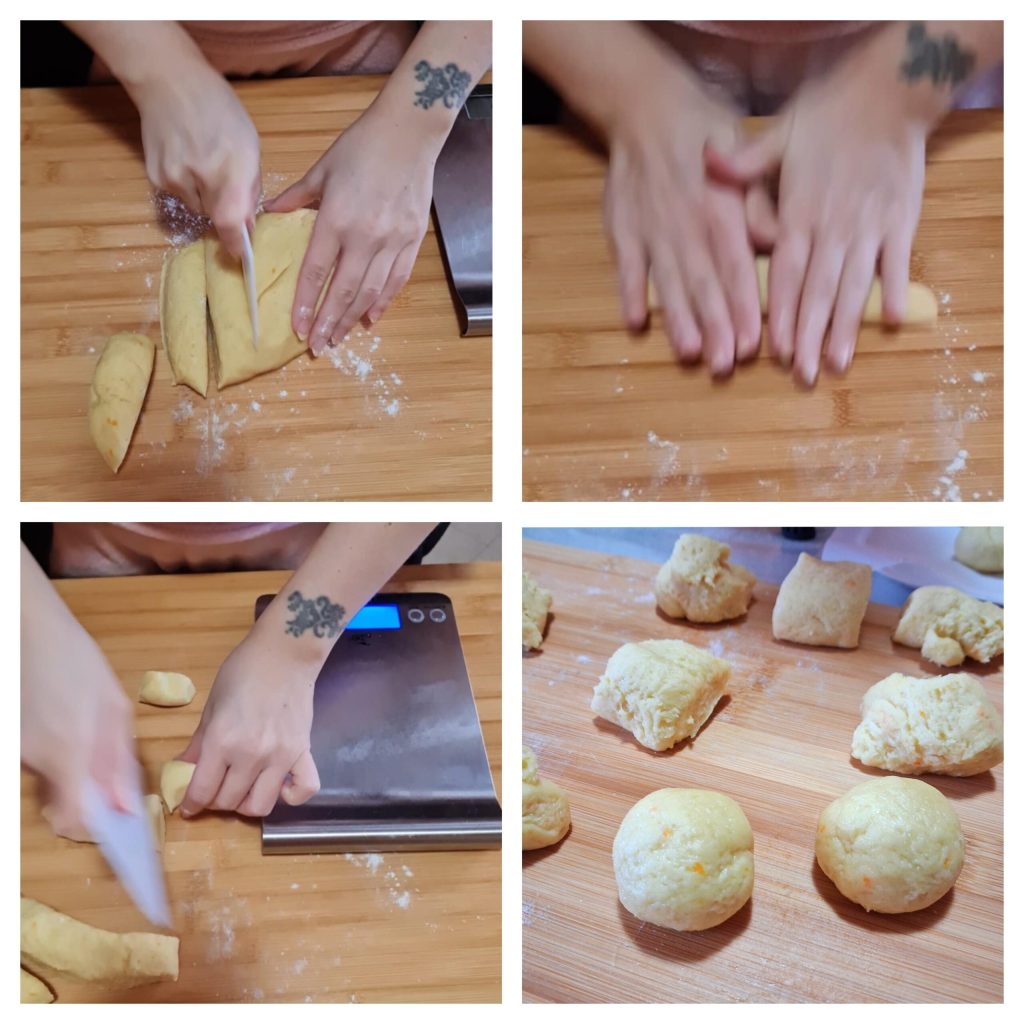 • Die Arbeitsfläche mit etwas Mehl bestäuben und aus dem Teig Zylinder oder Stangen formen, die dann in Stücke geschnitten werden. Mit den Händen Kugeln von jeweils 20-30 g formen. Ich habe sie auf der Waage gemessen, ihr könnt es aber auch nach Augenmaß machen.