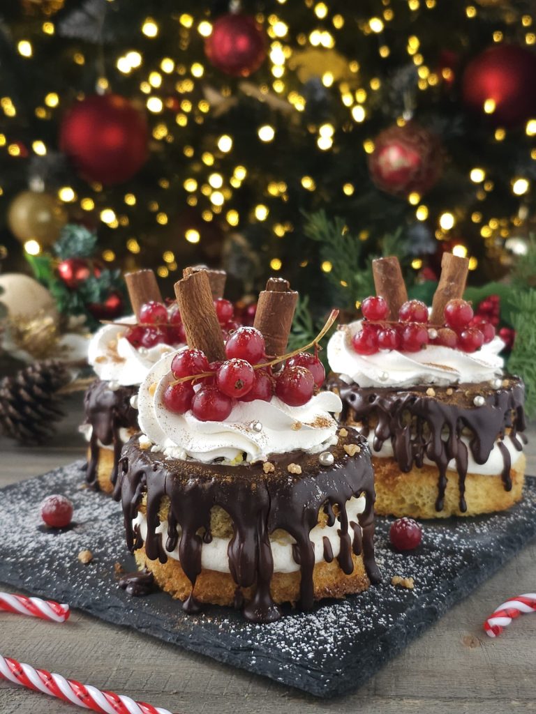 Die Oberfläche der Törtchen glasieren und für 30 Minuten im Kühlschrank fest werden lassen. Die Törtchen aus dem Kühlschrank nehmen und die Oberfläche mit Sahnehäubchen, Zimtpulver und Zimtstangen, roten Johannisbeeren, Haselnusskrokant und Zuckerperlen dekorieren. Und da sind sie, fertig. Ich hoffe, euch gefällt mein letztes Rezept, bis zum nächsten Mal Freunde.
