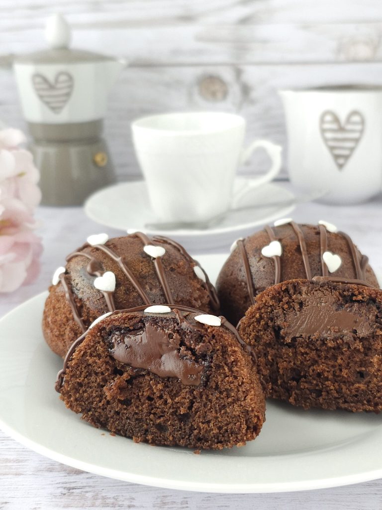Um diese Moncake zuzubereiten, sollten Sie zunächst einige Löffel Nutella einfrieren. Legen Sie einfach einige Löffel Nutella auf ein Backpapier und frieren Sie sie für 30 Minuten ein. In der Zwischenzeit in einer Schüssel das Ei mit dem Zucker und der Vanilleessenz mit einem Handschneebesen schlagen, bis Sie eine schaumige weiße Creme erhalten. Sonnenblumenöl und Milch hinzufügen und vorsichtig weiter rühren. Dann das gesiebte Mehl, die Prise Salz und das Backpulver hinzufügen und gut vermischen. Schließlich das ungesüßte Kakaopulver hinzufügen und rühren, bis ein glatter und homogener Teig entsteht.