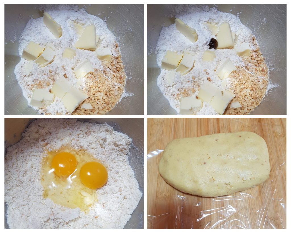 Um diese Nutella-Strudel-Kekse zuzubereiten, könnt ihr jede Küchenmaschine verwenden oder den Teig von Hand in einer Schüssel und dann auf einem Teigbrett kneten. Ich habe aus Bequemlichkeit die Küchenmaschine benutzt. In die Schüssel der Küchenmaschine das Weizenmehl 00, den Kristallzucker, das Haselnussmehl, die Kartoffelstärke, das Salz, das Backpulver, die Butter und die Vanilleessenz geben und die Maschine für ein paar Minuten auf Stufe 2 stellen, indem ihr das K-Blatt (Flachrührer) verwendet. Dann die Eier hinzufügen und noch ein paar Minuten mischen, bis ihr einen glatten und homogenen Teigklumpen erhaltet. Sollte der Teig noch hart sein, einfach einen Schuss Milch hinzufügen, um alles zu verdichten. Den Mürbeteig in Frischhaltefolie gewickelt etwa 1 Stunde im Kühlschrank ruhen lassen. Oder ihr könnt ihn auch am Vortag zubereiten und den Mürbeteig über Nacht im Kühlschrank lassen.