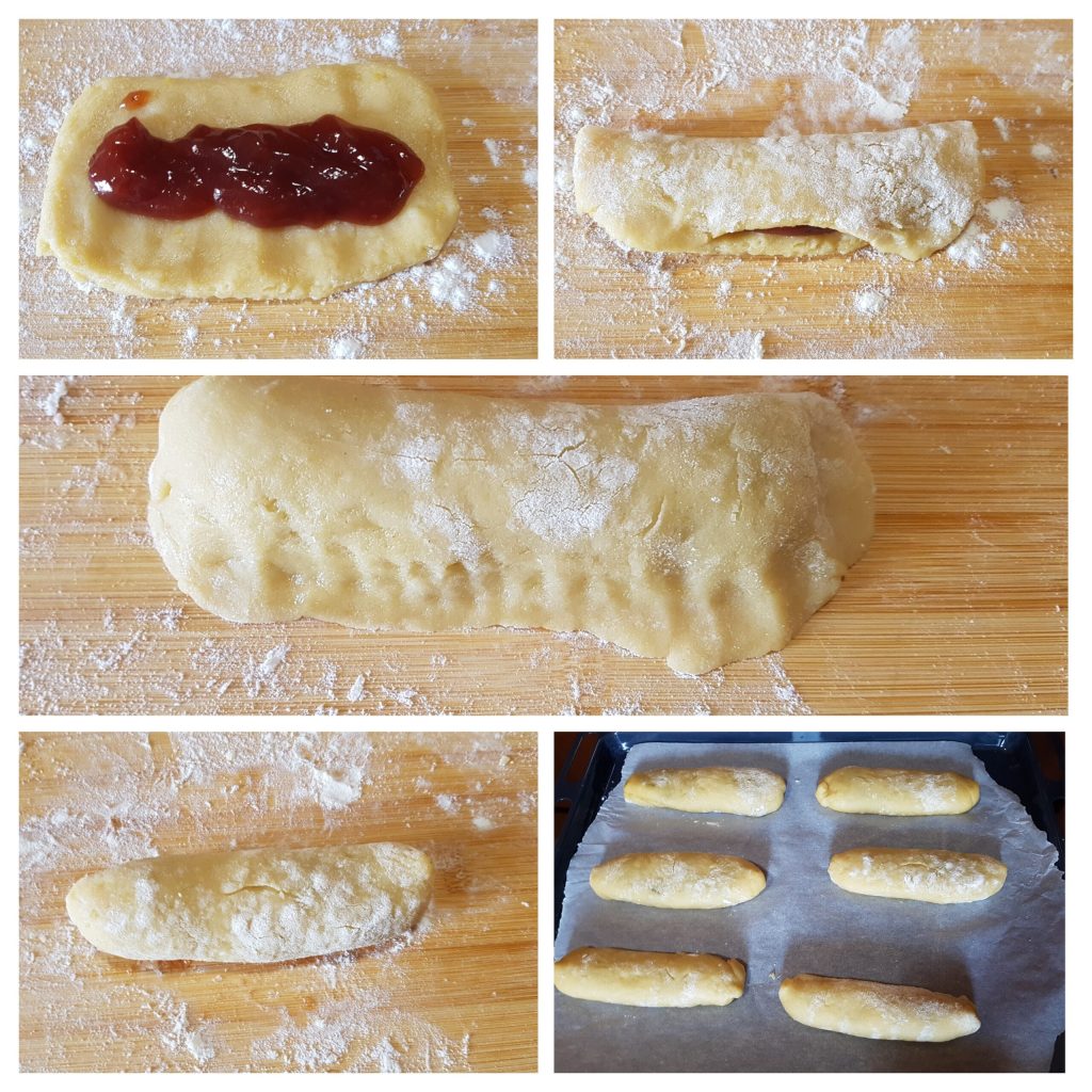 • Ein kleines Stück Teig nehmen, mit den Händen verlängern und verbreitern. In die Mitte die Erdbeermarmelade der Länge nach einfüllen. Den Rand gut verschließen und mit den Fingern einen Zylinder formen und auf ein mit Backpapier ausgelegtes Blech legen. So mit dem Rest des Teigs fortfahren. Die Größe des Kekses bestimmt ihr selbst. Ich habe es vorgezogen, sie schön dick zu machen, aber man kann sie auch klein machen. Mit diesem Teig bekommt man mehr als ein Dutzend Kekse. Dann die Oberfläche jedes Kekses mit Milch bestreichen und mit Kristallzucker bestäuben. Im vorgeheizten statischen Ofen bei 180º für 20-25 Minuten backen oder bis die Oberfläche goldbraun ist. Herd ausschalten, aus dem Ofen nehmen und abkühlen lassen.