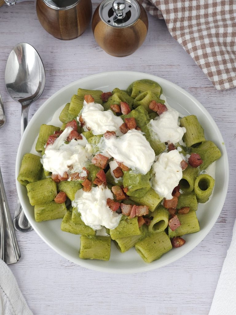 Nachdem die Pasta gegart ist, anrichten, indem knuspriger Speck und apulische Stracciatella hinzugefügt werden. Und schon ist sie fertig. Ich hoffe, euch gefällt mein letztes Rezept, bis zum nächsten Mal, Freunde.