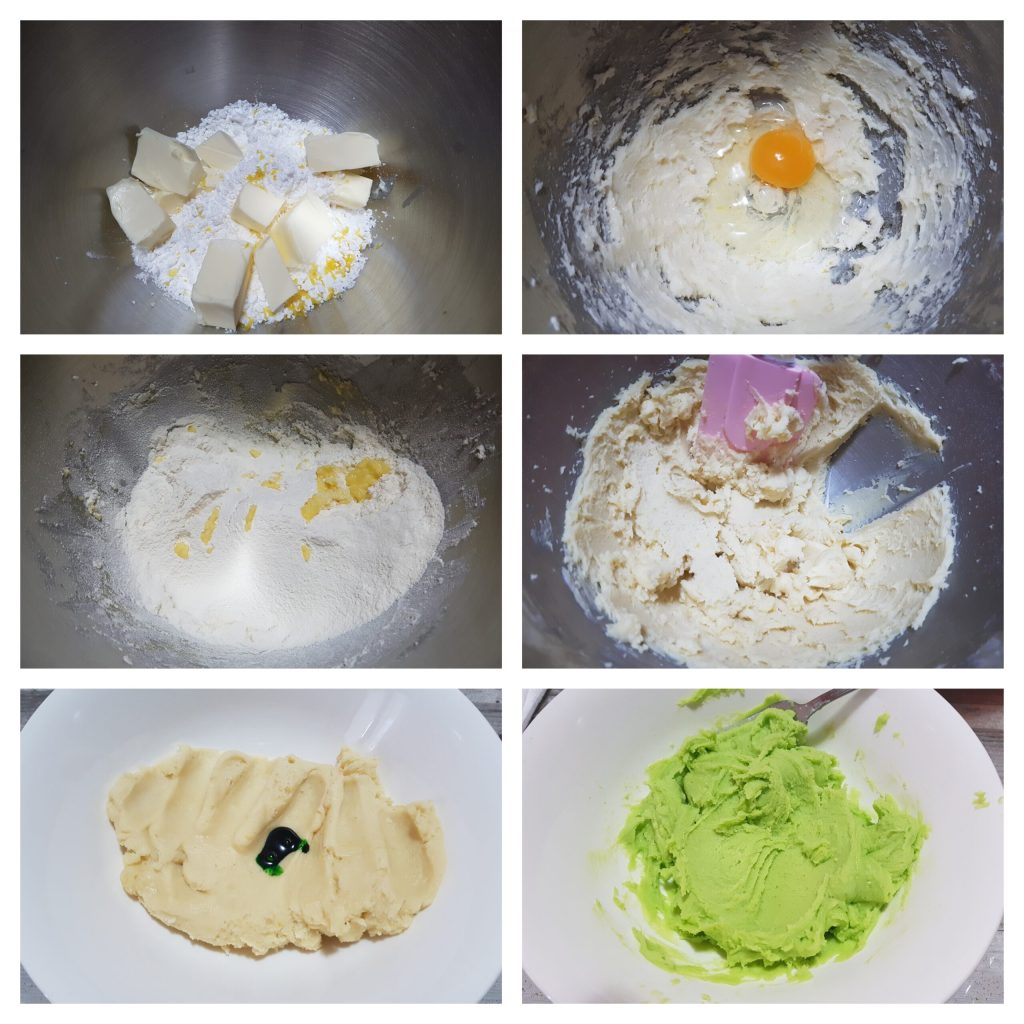 Um diese leckeren Pistazienherz-Kekse zuzubereiten, geben Sie die weiche Butter in Stücken, die geriebene Schale einer Zitrone, die Vanilleessenz und den Puderzucker in die Schüssel der Küchenmaschine. Setzen Sie den Schneebesen ein und lassen Sie die Maschine 5-8 Minuten auf höchster Geschwindigkeit laufen. Dann das Ei hinzufügen und noch einige Minuten weiterschlagen. Das gesiebte Mehl, die Kartoffelstärke und das Salz hinzufügen und noch einige Minuten schlagen, bis eine homogene, kompakte, aber sehr weiche Masse entsteht. Wer keine Küchenmaschine hat, kann auch einen elektrischen Handmixer verwenden und dabei die gleiche Vorgehensweise befolgen. Zum Schluss die grüne Lebensmittelfarbe hinzufügen und gut vermischen.