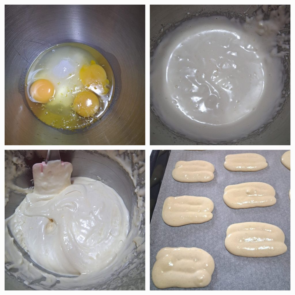 Um diese köstlichen Raffioli zuzubereiten, muss der Teig hergestellt werden. In einer großen Schüssel die Eier mit dem feinen Zucker und der Vanilleessenz oder der geriebenen Zitronenschale für 15 Minuten schlagen, bis sie schaumig und weißlich sind. Schließlich nach und nach das gesiebte Mehl 00 und das Salz hinzufügen und mit einem Spatel von unten nach oben mischen, ohne die Masse zu entlüften. Ein rechteckiges Backblech oder ein Backblech mit Backpapier auslegen. Den Teig in einen Spritzbeutel mit glatter Tülle füllen und ovale Kuchen von 6-7 cm Länge und 2-3 cm Breite formen, die voneinander abstehen. Bei 180 °C Umluft im vorgeheizten Backofen ca. 10-12 Minuten backen, bis sie goldbraun und aufgegangen sind. Abschalten, aus dem Ofen nehmen und abkühlen lassen.