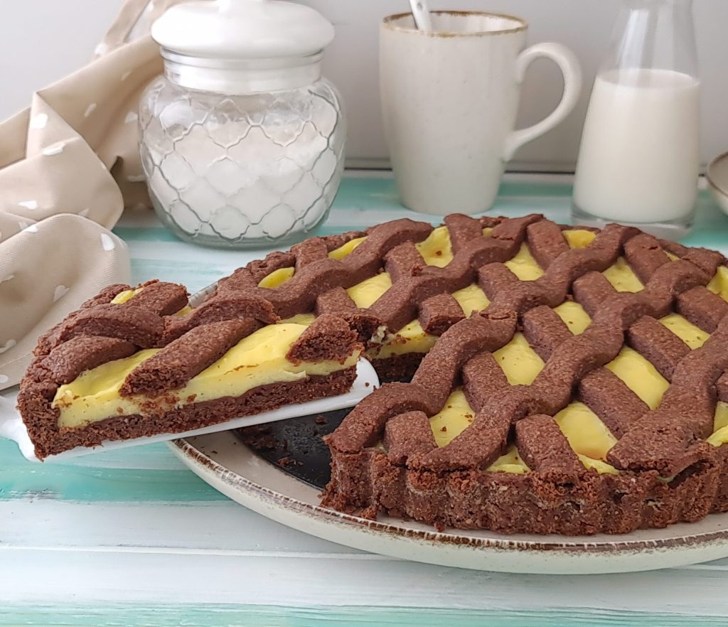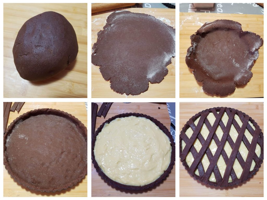 Den Mürbeteig aus dem Kühlschrank nehmen, etwas mit den Händen kneten und auf einer bemehlten Arbeitsfläche mit einem Nudelholz auf eine Dicke von ca. 2-3 mm ausrollen und eine Tarteform von 24 cm Durchmesser, die zuvor gebuttert und bemehlt wurde, auslegen. Den Boden mit einer Gabel einstechen und die Konditorcreme hineingeben. Mit dem restlichen Mürbeteig die Oberfläche mit den klassischen Streifen dekorieren, um ein perfektes Gitterwerk zu bilden. Im vorgeheizten statischen Backofen bei 175° für 40-45 Minuten backen. Ich empfehle, die Form auf dem unteren Backblech zu backen. Ausmachen, herausnehmen und abkühlen lassen.