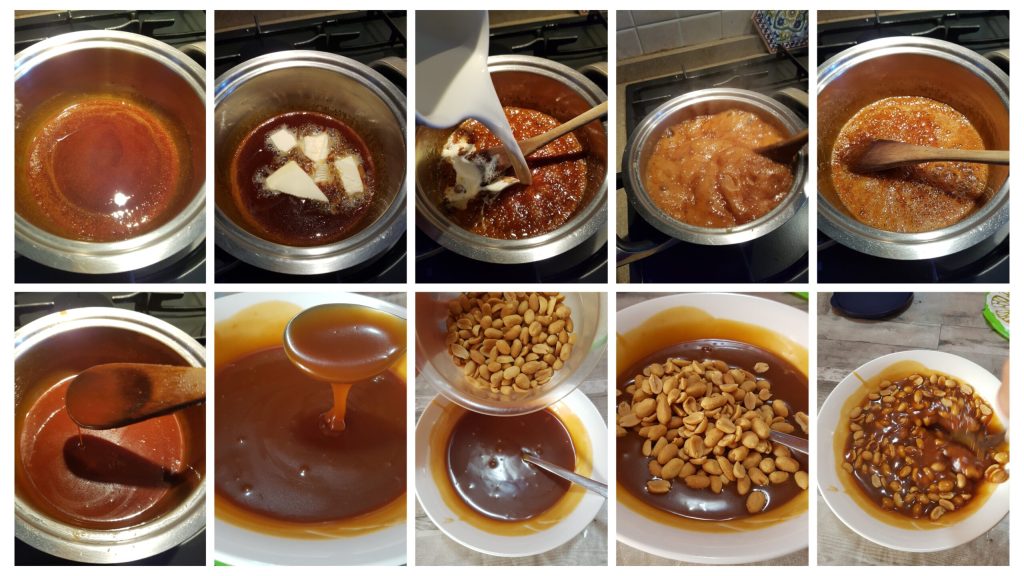 Um das Snickers-Semifreddo zuzubereiten, muss zunächst das Karamell vorbereitet werden. Auf mittlerer Hitze in einem kleinen Topf einen Teil des Zuckers schmelzen lassen und nach und nach den restlichen Zucker hinzufügen, bis ein braunes Karamell entsteht (ideale Temperatur 170°). Die Butter in Stücken hinzufügen und kräftig rühren. In der Zwischenzeit in einem anderen kleinen Topf die Sahne zum Kochen bringen. Die heiße Sahne langsam zum Karamell gießen, dabei bitte darauf achten, sich nicht zu verbrennen, und mit einem Holzlöffel bei ausgeschalteter Hitze rühren. Bei Raumtemperatur abkühlen lassen und dabei gelegentlich umrühren. Schließlich die Erdnüsse hinzufügen.