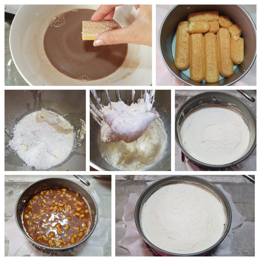 Zuerst den Boden der Form mit Backpapier auslegen. Die Löffelbiskuits in der zuvor abgekühlten Milch-Kakao-Mischung leicht einweichen und auf den Boden der Form legen, dann im Kühlschrank fest werden lassen. In der Zwischenzeit die Creme vorbereiten. In einer großen Schüssel den gut gekühlten Mascarpone aus dem Kühlschrank, die frische flüssige Sahne, ebenfalls gut gekühlt, zusammen mit dem Puderzucker, der Vanille hinzugeben und mit den elektrischen Handmixern einige Minuten schlagen, bis eine schaumige und cremige Masse entsteht. Die Form aus dem Kühlschrank nehmen und die Hälfte der Masse darauf verteilen, einige Esslöffel des bereits abgekühlten Karamells mit Erdnüssen darauf geben. Die andere Hälfte der Füllung darauf verstreichen und gut glätten. Für 3 Stunden im Gefrierfach fest werden lassen.