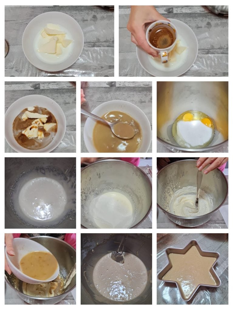 Um diesen leckeren Sternkuchen zuzubereiten, muss der Kaffeekuchen im Voraus vorbereitet werden. In einem kleinen Topf die Butter mit der Milch und dem Kaffee schmelzen. Wenn alles geschmolzen ist, ausschalten und abkühlen lassen. In der Zwischenzeit in einer Schüssel die Eier, die Vanilleessenz und den Kristallzucker mit einem elektrischen Schneebesen einige Minuten lang aufschlagen. Das Mehl nach und nach unterheben und von unten nach oben mischen. Dann nach und nach die Milch-Kaffee-Mischung hinzufügen und gründlich vermengen. Zum Schluss das Backpulver hinzugeben. Die glatte Masse in eine zuvor gefettete und bemehlte 24-26 cm große sternförmige Form füllen und im vorgeheizten statischen Ofen bei 180º für ca. 35 Minuten backen, Stäbchenprobe machen. Aus dem Ofen nehmen, aus der Form lösen und abkühlen lassen.