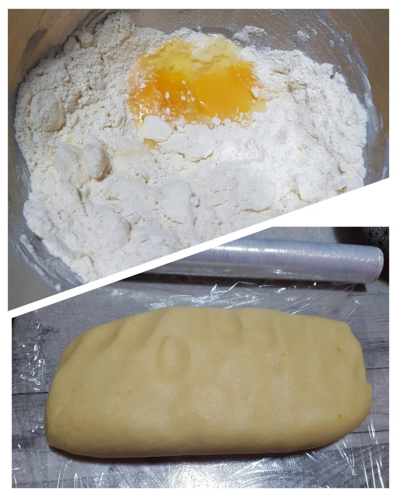 • Um diese süße Torte mit Füllung zuzubereiten, bereite zunächst den Mürbeteig zu. Du kannst den Mürbeteig in jeder Küchenmaschine kneten, ich habe aus Bequemlichkeit die Küchenmaschine benutzt. Setze zuerst den Flachrührer, also das (K), in die Schüssel der Küchenmaschine ein und füge die kalte Butter in Stücken zusammen mit dem Puderzucker, dem gesiebten Mehl, einer Prise Salz, dem Backpulver, der Vanille und der geriebenen Zitronenschale hinzu und stelle die Maschine auf Geschwindigkeit 2 für ein paar Minuten. Füge dann das Ei und das Eigelb hinzu und mische weiter für ein paar Minuten, bis ein glatter und homogener Teig entsteht. Den Mürbeteig gut formen, in Frischhaltefolie einwickeln und für etwa eine Stunde im Kühlschrank ruhen lassen. Du kannst den Mürbeteig auch problemlos am Vortag zubereiten.