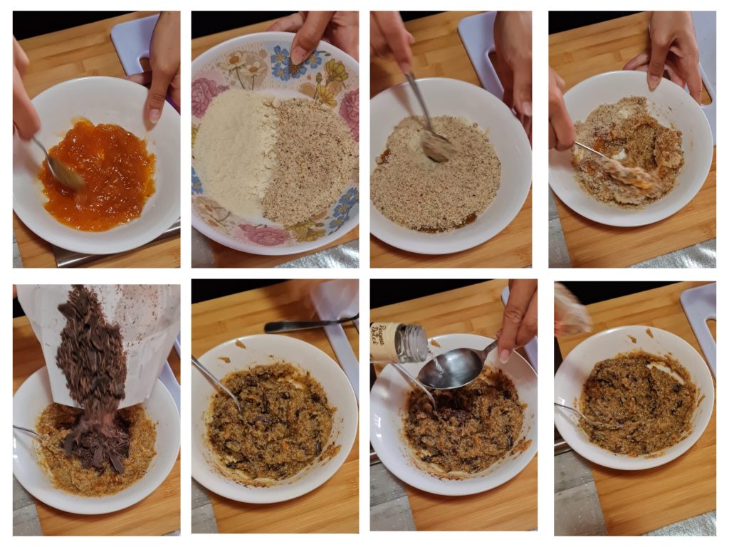 • In einer Schüssel die Aprikosenmarmelade mit den fein gehackten Mandeln und Haselnüssen mischen und gut vermengen. Zum Schluss die gehackte Zartbitterschokolade und den Esslöffel Likör hinzufügen und sorgfältig mischen.