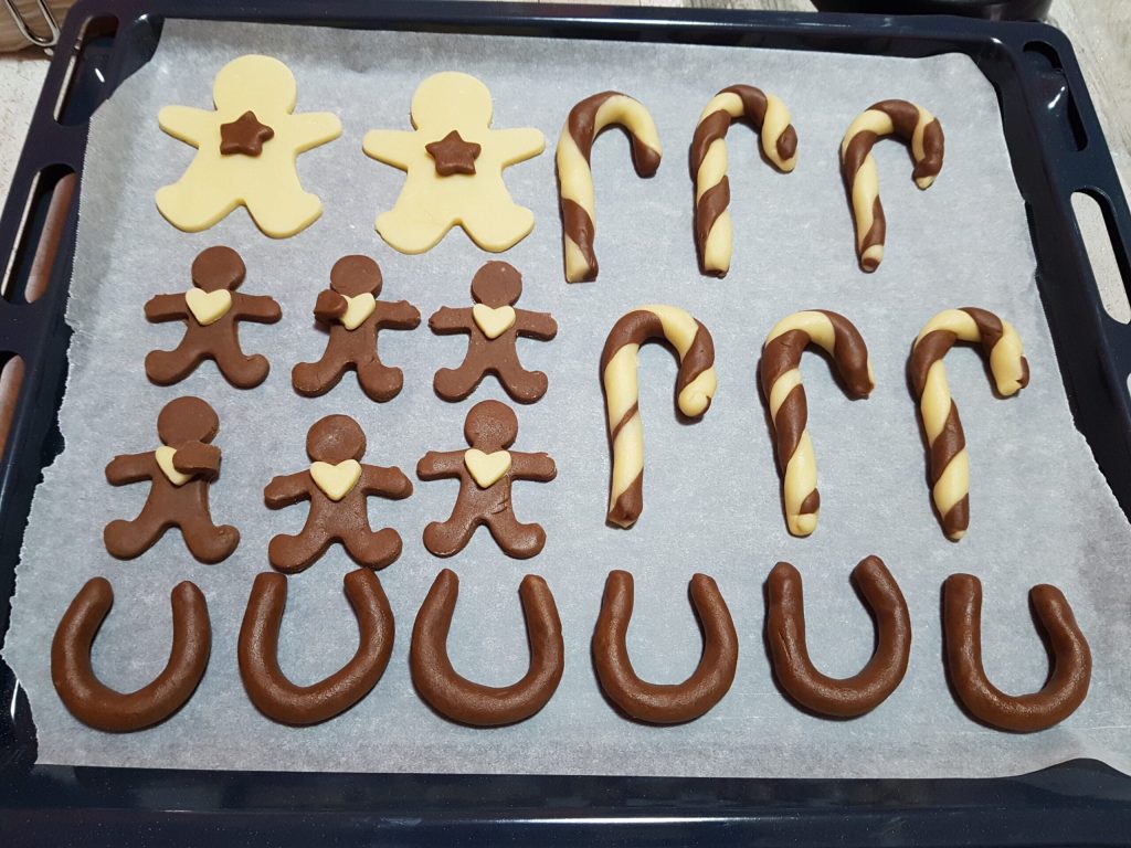 Um das Männchen zu erstellen, reicht es, den Kakaoteig mit einem Nudelholz auszurollen und mit einem Lebkuchenmann-Ausstecher die Männchen auszustechen. Aus dem weißen Teig kleine Herzen formen und sie in der Mitte des Bauches anbringen. Auch die Männchen aus dem weißen Teig herstellen und mit dem Kakaoteig kleine Sternchen erzeugen und auch diese in die Mitte des Bauches legen. Mit dem restlichen Kakaoteig das Hufeisenkeks herstellen, indem man eine kleine Kordel formt und sie zu einem C schließt. Die Kekse auf ein mit Backpapier ausgelegtes Backblech legen und im vorgeheizten statischen Ofen bei 180 °C für 13-15 Minuten backen.
