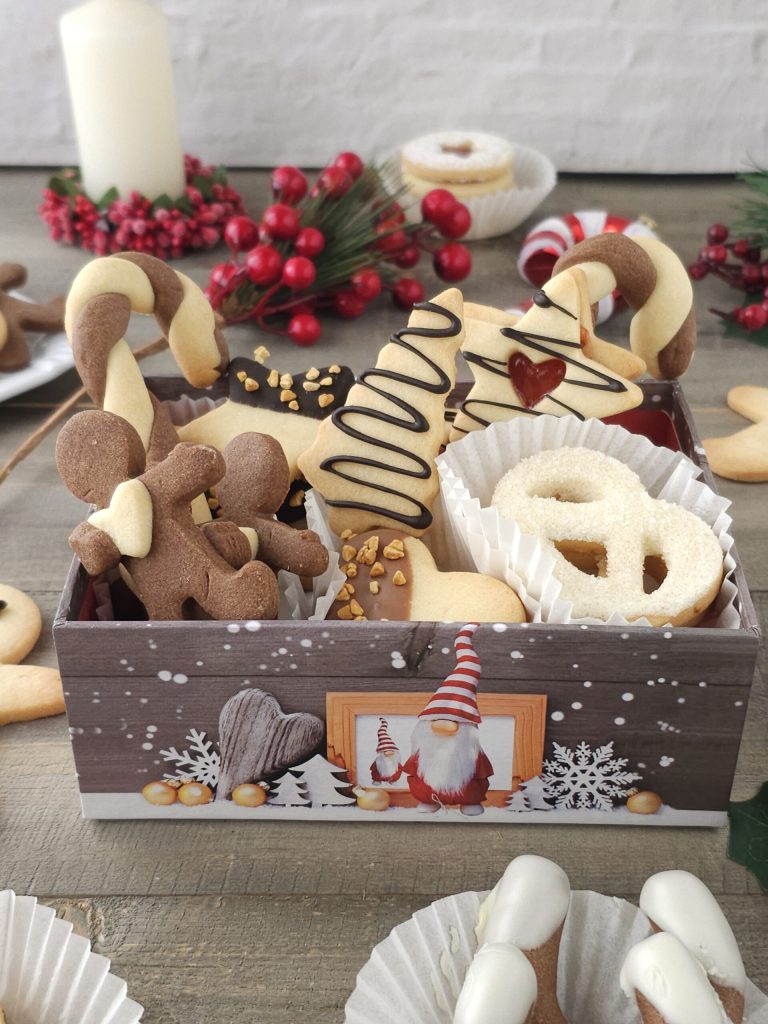 Die weihnachtliche Keksdose kann auch lange im Voraus hergestellt werden. Diese Kekse können auch zehn Tage vor dem Servieren oder Verschenken zubereitet werden. Ihr könnt jede zur Verfügung stehende Form verwenden.