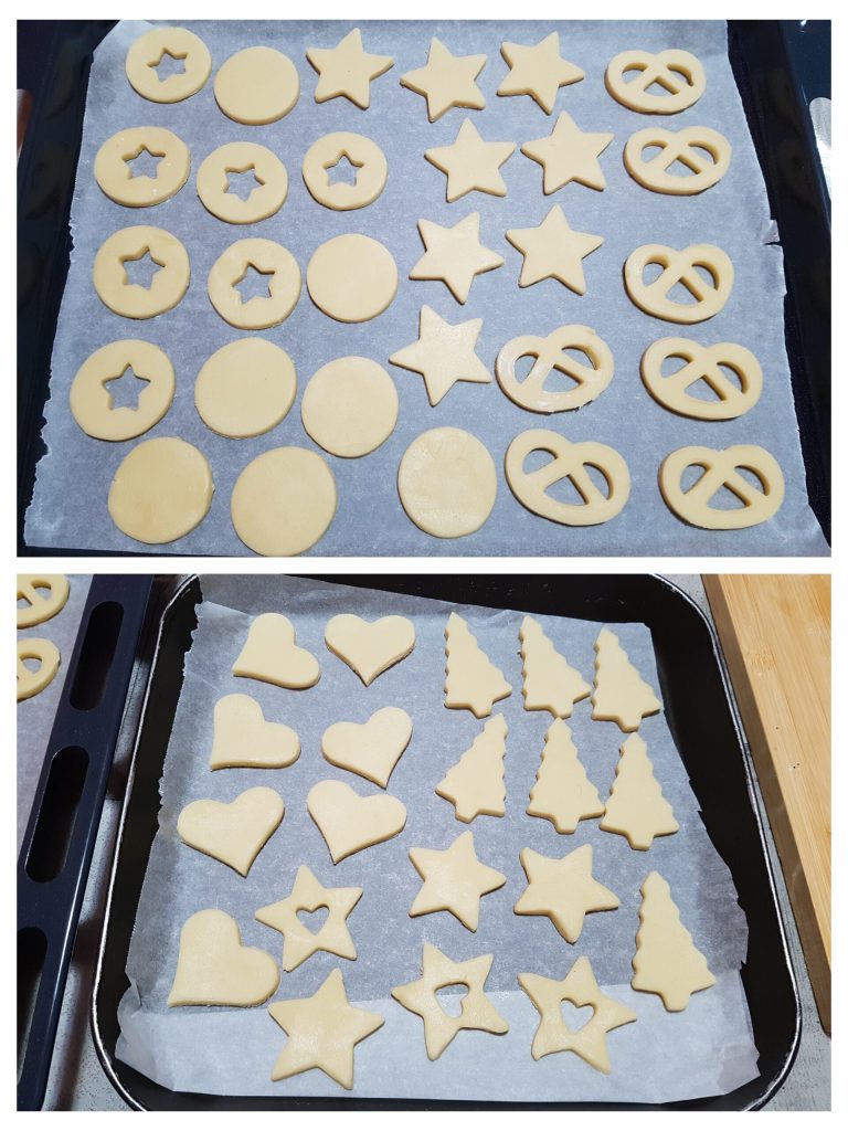 Mit dem Rest des weißen Mürbeteigs die anderen Kekse ausstechen. Es reicht, den Teig mit dem Nudelholz auszurollen und mit den verfügbaren Ausstechern auszustechen. Ihr könnt auch gefüllte Kekse herstellen. Dabei die Hälfte der Kekse ganz lassen und die andere Hälfte in der Mitte mit Sternen oder Herzen ausstechen. Auch diese im vorgeheizten statischen Ofen bei 180 °C für 10-12 Minuten backen.