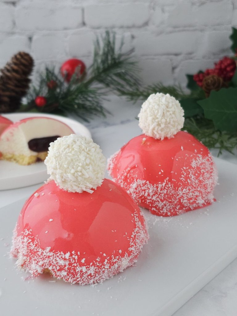 Hallo Freunde, heute präsentiere ich euch dieses wunderbare weihnachtliche halbgefrorene Hütchen, das ihr während der Weihnachtszeit zubereiten könnt, um eure Gäste zu beeindrucken. Es ist eine spezielle Einzelportion, ein wirklich eindrucksvolles Dessert, bestehend aus einem Biskuitboden, einer leichten cremigen weißen Schokoladenmousse, einem Himbeermarmeladenkern und schließlich einer glänzenden farbigen Glasur. Nachfolgend findet ihr das Rezept..