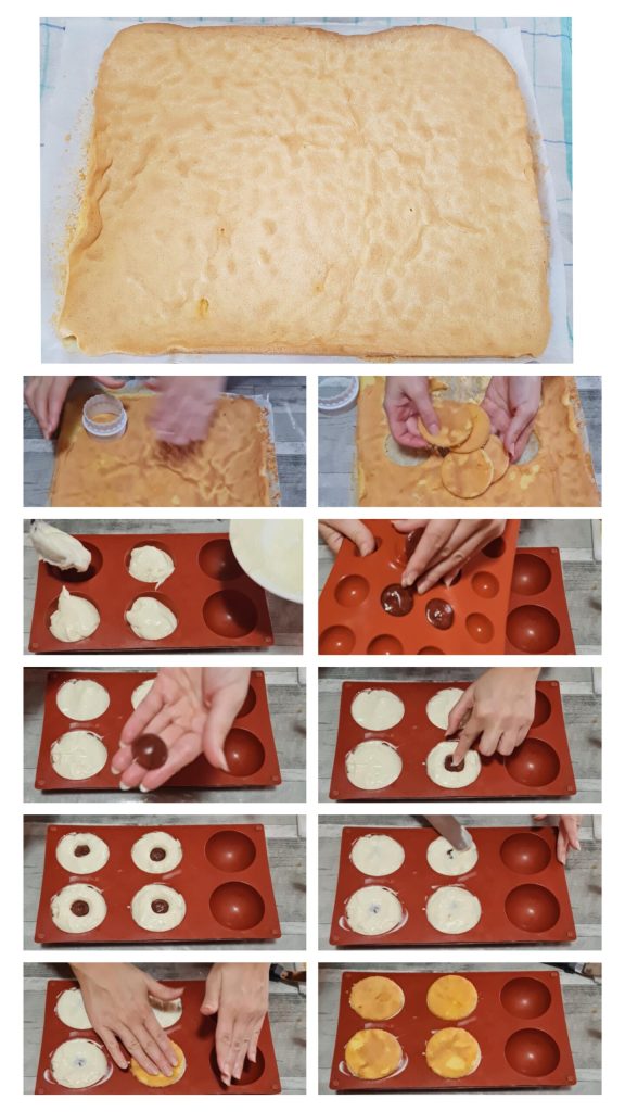 Wenn der Biskuitboden abgekühlt ist, mit einem Ausstecher Kreise von 6-8 cm ausschneiden und beiseite legen. Eine Silikon-Halbkugelform von 7-8 cm nehmen und die weiße Schokoladenmousse fast vollständig einfüllen. Das Himbeermarmeladen-Inlay entformen und in die Mitte der Mousse drücken. Zum Schluss eine Biskuitscheibe darauflegen und alles versiegeln. Für 3-4 Stunden ins Gefrierfach stellen.
