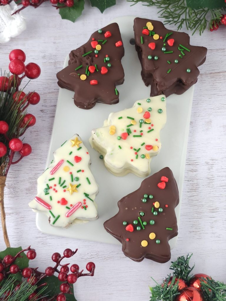Die Mascarpone- und Nutellacreme in einen Spritzbeutel geben und jede Basis füllen, dann mit der anderen Form wie ein Sandwich schließen. Insgesamt erhalten wir 7 Snacks, die wir auf ein Tablett legen und dann für 1 Stunde im Kühlschrank fest werden lassen. Nach der Ruhestunde schmelzen Sie die dunkle und die weiße Schokolade in zwei separaten Schüsseln im Wasserbad. Glasieren Sie jeden Snack nach Belieben und dekorieren Sie dann die Oberfläche mit bunten weihnachtlichen Zuckerstreuseln. Lassen Sie sie an der Luft oder im Kühlschrank trocknen, um den Vorgang zu beschleunigen.