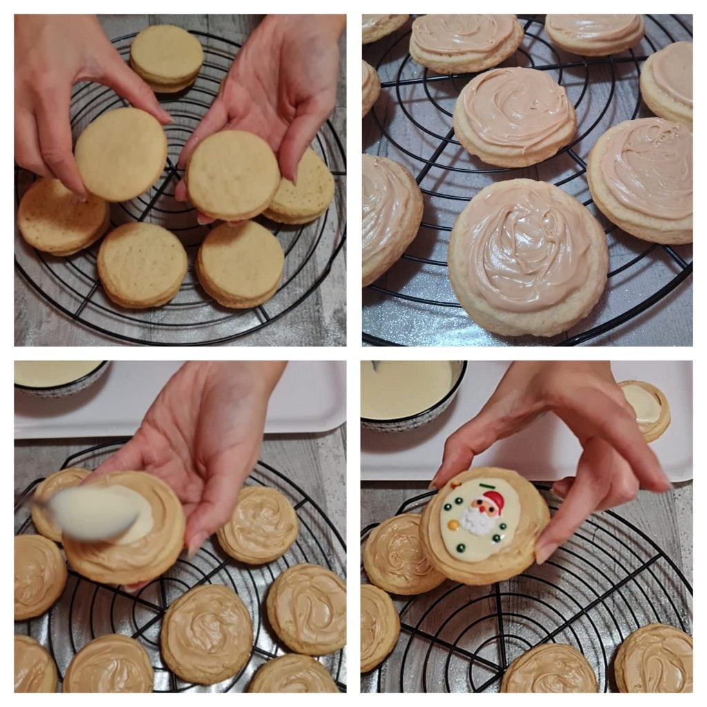 Wenn die Kekse abgekühlt sind, die weiße Schokolade im Wasserbad schmelzen und in die Mitte jedes Kreises einen Löffel weiße Haselnusscreme und einen Teelöffel weiße Schokolade geben, wie auf dem Foto zu sehen ist. Die Oberfläche der Kekse mit Weihnachtszuckerstreuseln dekorieren. Bei Raumtemperatur oder im Kühlschrank trocknen lassen.