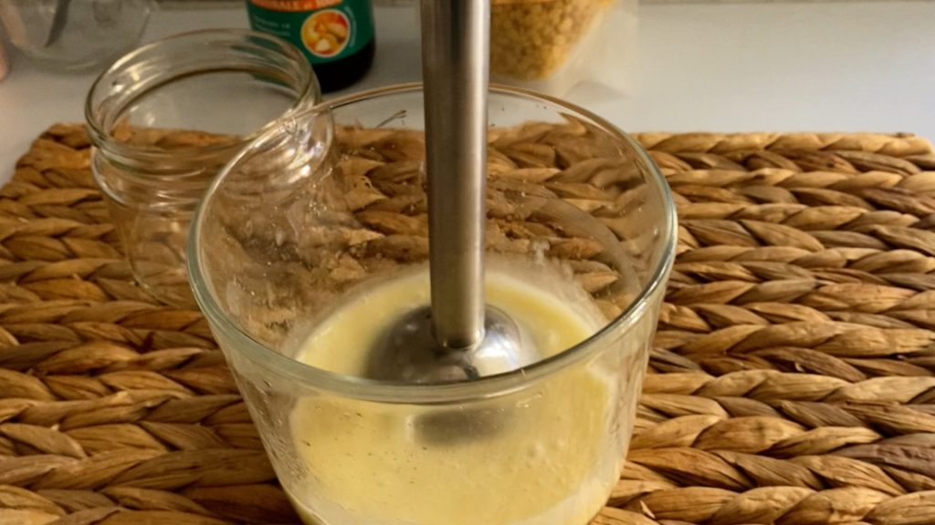 Mit einem Stabmixer alles zu einer Emulsion verarbeiten.