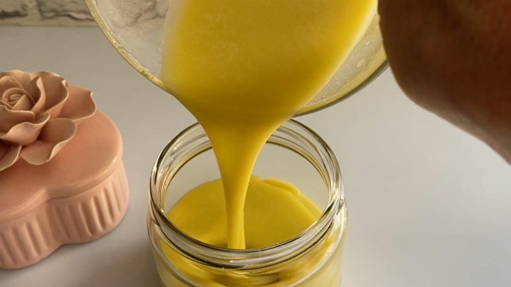 In einen Behälter füllen: Die Mischung in ein sauberes Glasgefäß umfüllen und bei Raumtemperatur abkühlen lassen, bis sie fest wird.