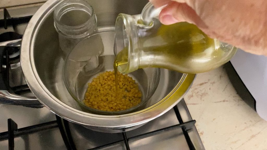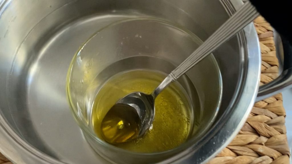 Zutaten schmelzen: In einem Topf im Wasserbad, das Olivenöl und das Bienenwachs. Rühren, bis alles vollständig geschmolzen und vermischt ist. Im selben Topf das Wasser erhitzen.