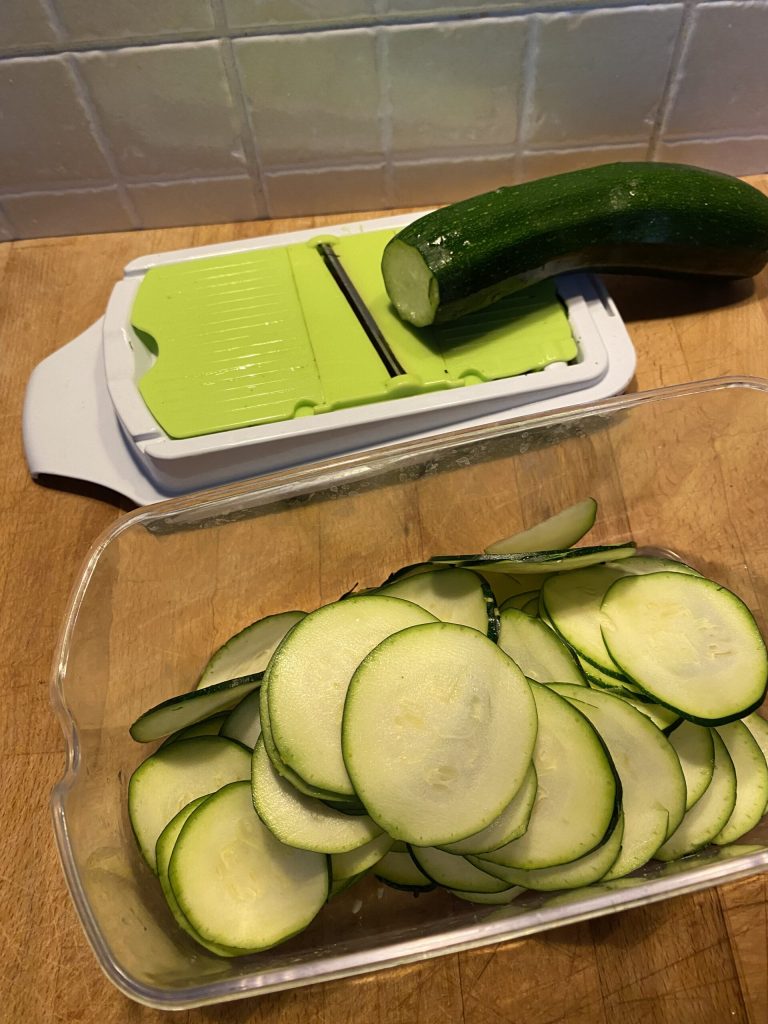 Vorbereiten der Zucchini: Beginnen Sie damit, die Zucchini gründlich zu waschen und abzutrocknen. Schneiden Sie sie dann in dünne Scheiben von etwa 0,5 cm Dicke. Sie können ein scharfes Messer oder eine Mandoline verwenden, um gleichmäßige Scheiben zu erhalten.
