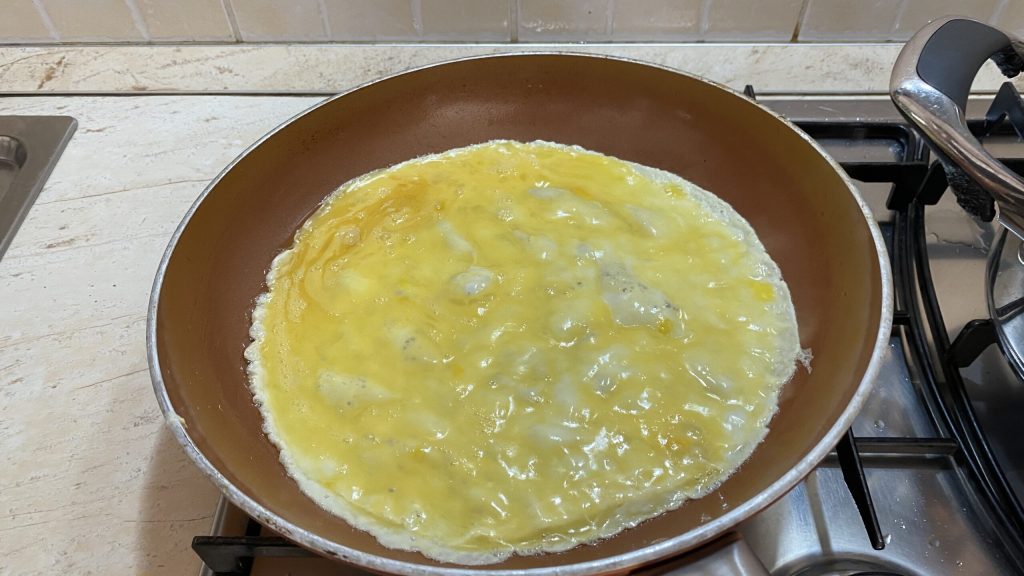 Kochen Sie es bei niedriger Hitze und wenden Sie es nicht wie eine Frittata. Falten Sie es einfach vorsichtig mit einem Spatel.