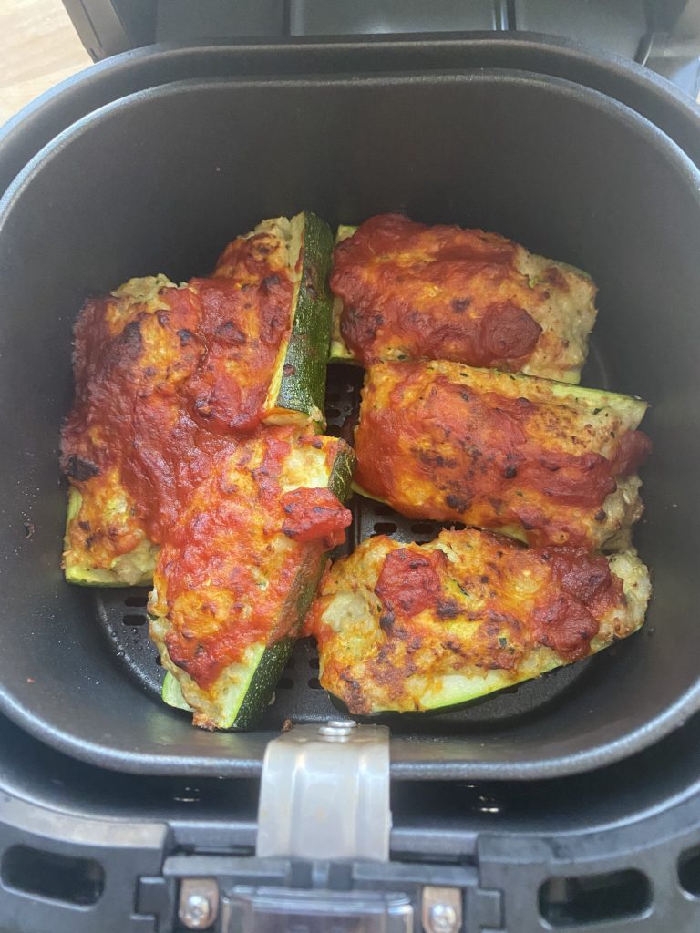 Nimm die gefüllten Zucchini aus der Heißluftfritteuse und lasse sie leicht abkühlen, bevor du sie servierst.