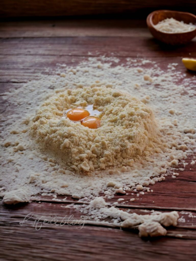 • Um den Mürbeteig zuzubereiten, beginnen Sie damit, das Mehl in einem Brunnen auf einer glatten Oberfläche zu verteilen. Geben Sie in die Mitte den Zucker, die in Stücke geschnittene Butter, die Eier, das Mehl und das Backpulver. Kneten Sie schnell alle Zutaten zu einer Kugel. Decken Sie den Teig mit Frischhaltefolie ab und stellen Sie ihn zum Ruhen in den Kühlschrank.