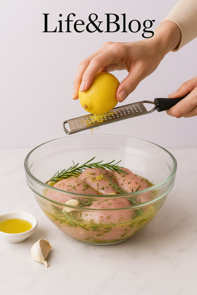 In einer großen, schönen Schüssel die Hähnchenteile anordnen. Den frischen Saft einer Zitrone darübergießen, großzügig die geriebene Schale hinzufügen, ein paar zerdrückte Knoblauchzehen (nicht zu viel, wenn du einen milden Geschmack bevorzugst) und ein paar Rosmarinzweige.