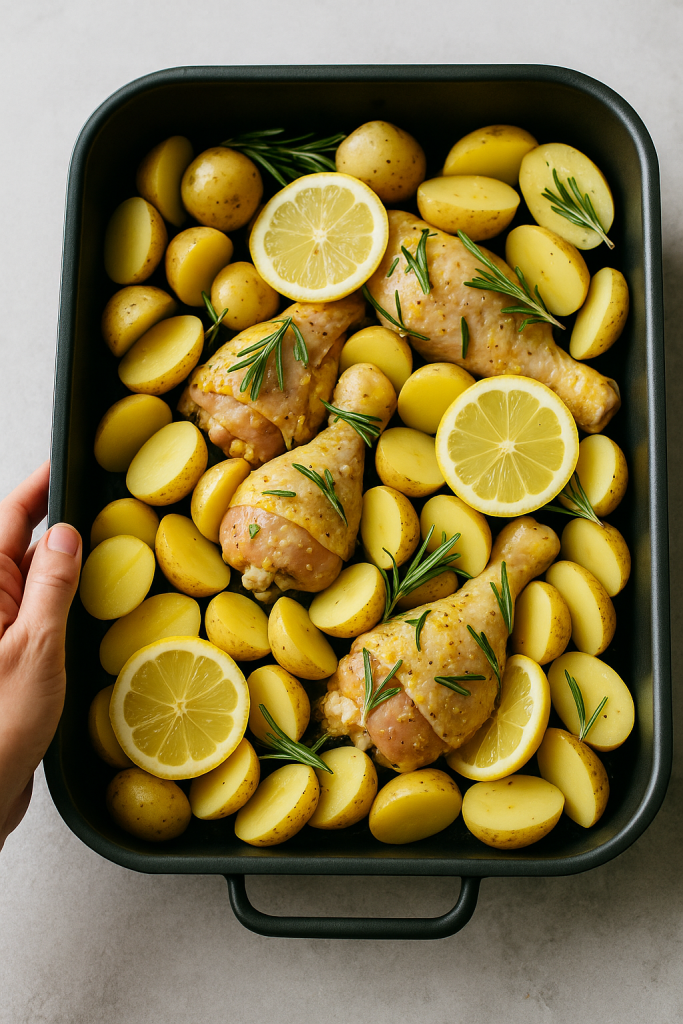 Wenn ich wenig Zeit habe, aber trotzdem etwas Leckeres und Leichtes auf den Tisch bringen möchte, sind Zitronenhähnchenbrust mit neuen Kartoffeln und Rosmarin eine meiner Lieblingslösungen. Sie sind im Handumdrehen zubereitet und backen zusammen mit den Kartoffeln im Ofen. Die Zitrone macht das Fleisch zart und aromatisch, der Rosmarin verleiht das gewisse rustikale Etwas, und die Kartoffeln nehmen alle Aromen auf und schaffen eine perfekte Beilage. Ein einfaches, gesundes und komplettes Rezept, ideal für ein Familienessen oder sogar für das Mittagessen am nächsten Tag!
