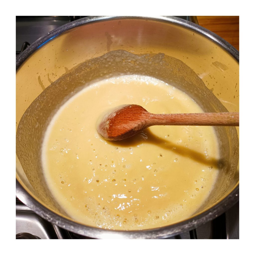 Die lauwarme Milch, das Salz und die Muskatnuss hinzufügen und häufig umrühren, damit nichts am Boden klebt. Wenn sich Blasen an der Oberfläche bilden, könnt ihr den Herd ausschalten. Es dauert etwa 15 Minuten.