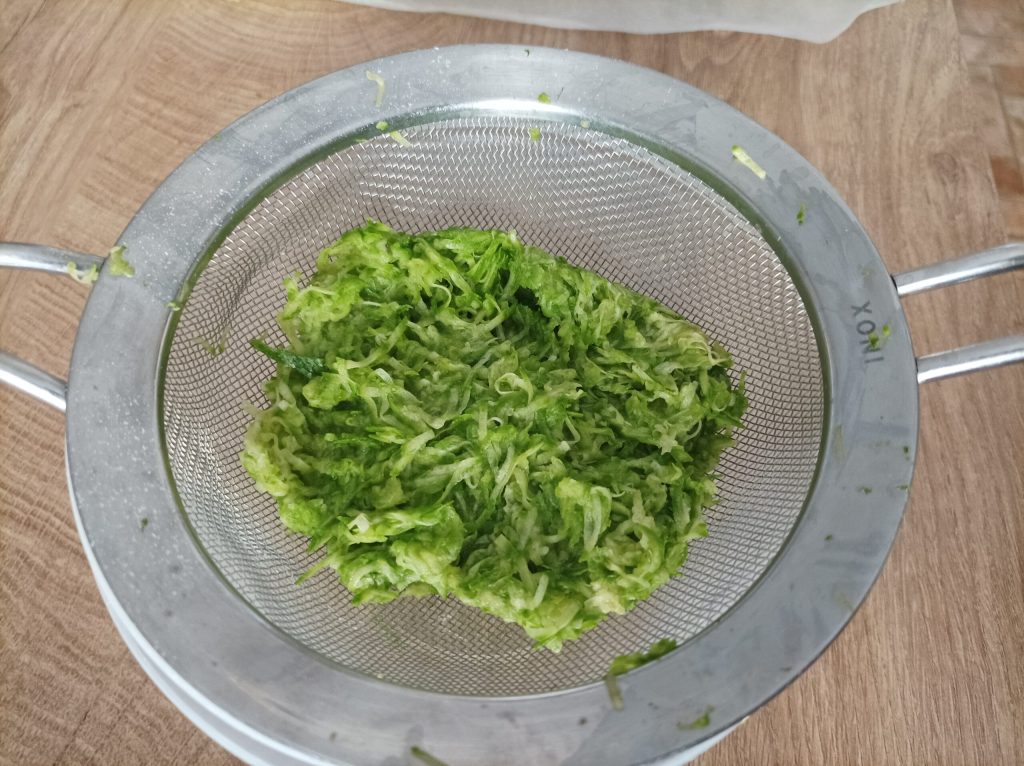 Zuerst die Zucchini reiben und mit einer Prise Salz abtropfen lassen.