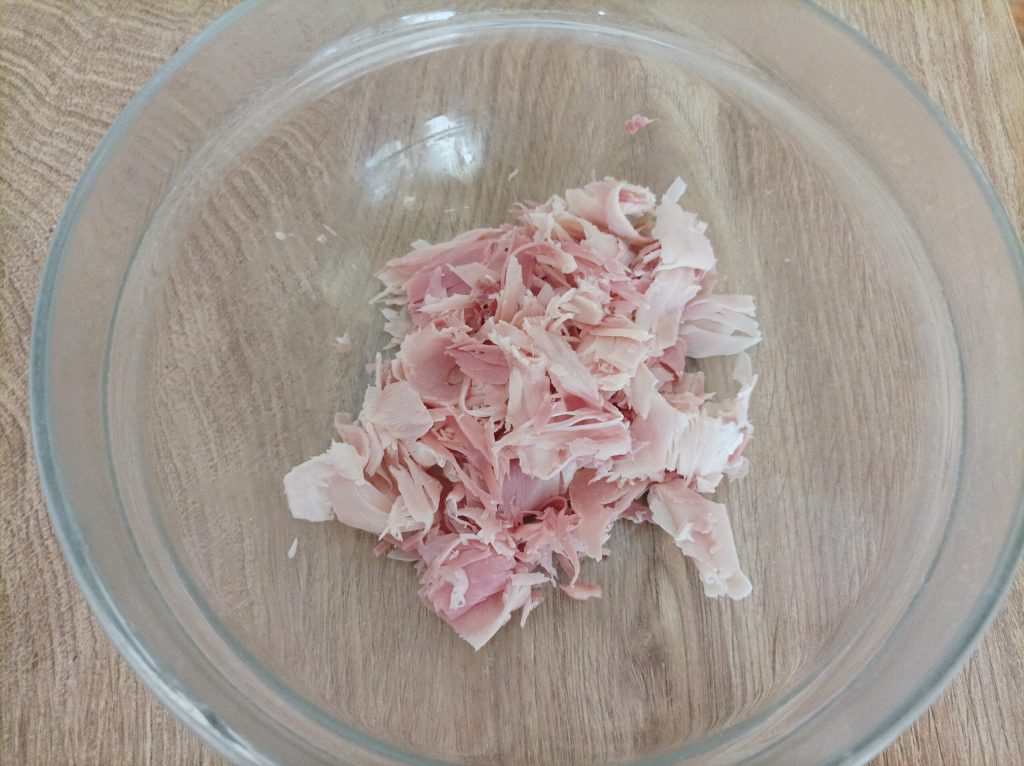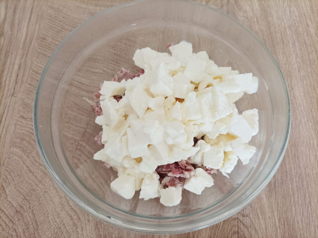 Dann den Schinken, den Mozzarella und die Wurst in kleine Stücke schneiden.