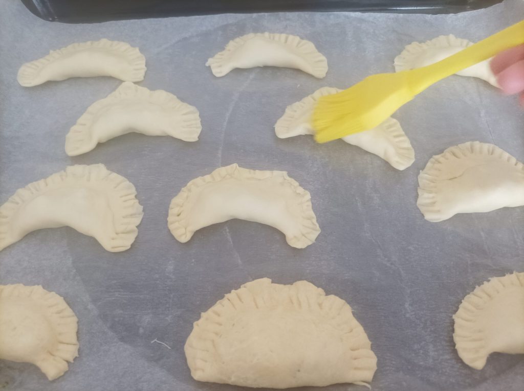 Auf einem mit Backpapier ausgelegten Backblech anrichten, die Oberfläche mit einem mit etwas Milch vermischten Eigelb bestreichen und im vorgeheizten Umluftofen bei 180° für 15 Minuten backen.