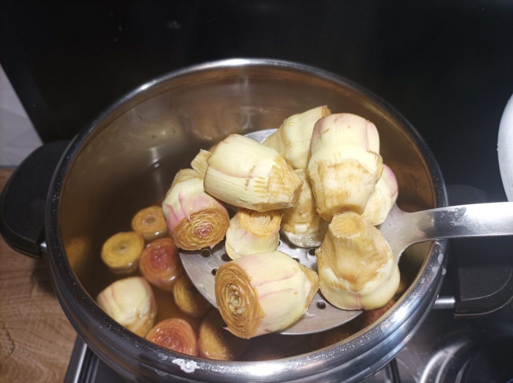 Geben Sie in einen Topf Wasser, Essig und Salz, sobald es zu kochen beginnt, geben Sie die Artischockenherzen hinzu und lassen Sie sie 5 Minuten kochen. Wenn Sie die gleiche Menge wie ich gemacht haben, blanchieren Sie sie in zwei Chargen, entfernen Sie die ersten Artischockenherzen und geben Sie die anderen hinein.