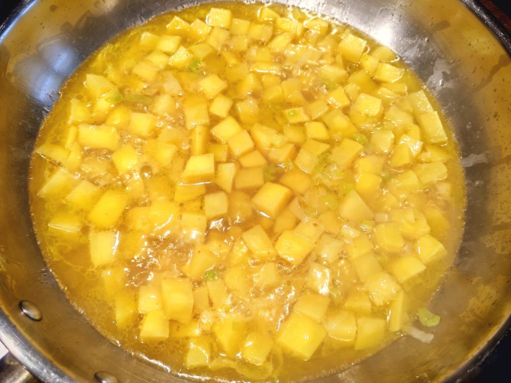 • Mit einem Teil der Brühe die Kartoffeln bedecken, Salz und Pfeffer hinzufügen, abdecken und bei niedriger Hitze 15 Minuten köcheln lassen, dabei gelegentlich umrühren.