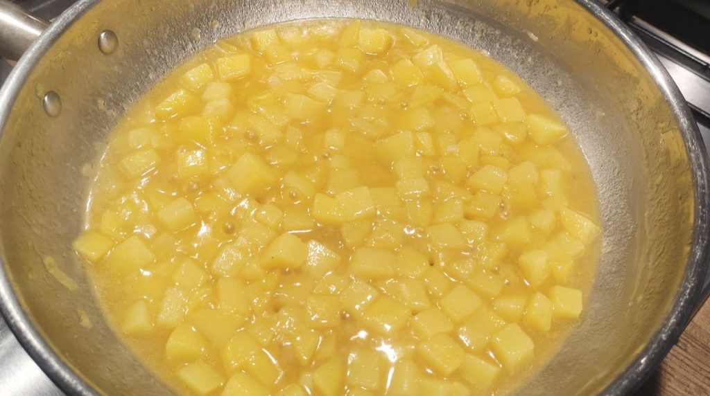 • Wenn die Frühlingszwiebel gut angebraten ist, die abgetropften Kartoffeln hinzufügen und bei mittlerer Hitze 2 Minuten anbraten, dabei ständig umrühren, um ein Ankleben am Boden zu vermeiden.