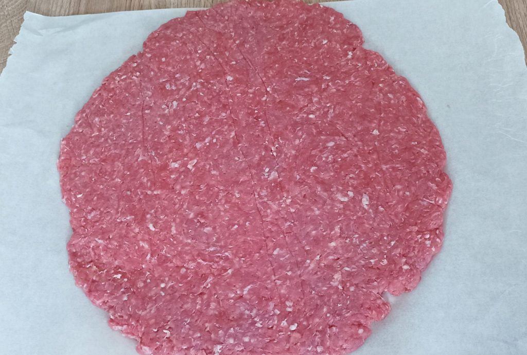 Nehmen Sie jetzt das Fleisch, fügen Sie nur Salz hinzu, formen Sie einen Fladen und formen Sie zwischen zwei Blättern Backpapier eine Scheibe, indem Sie ein Nudelholz verwenden, um eine gleichmäßige Dicke zu erzielen.