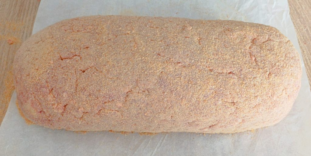 Rollen Sie den Braten auf und schließen Sie die Ränder so gut wie möglich, um das Fleisch zu versiegeln. Wenn Sie den Hackbraten geschlossen haben, bereiten Sie etwas Paniermehl mit Kurkuma vor und rollen Sie den Hackbraten darin, um ihn von allen Seiten zu panieren.