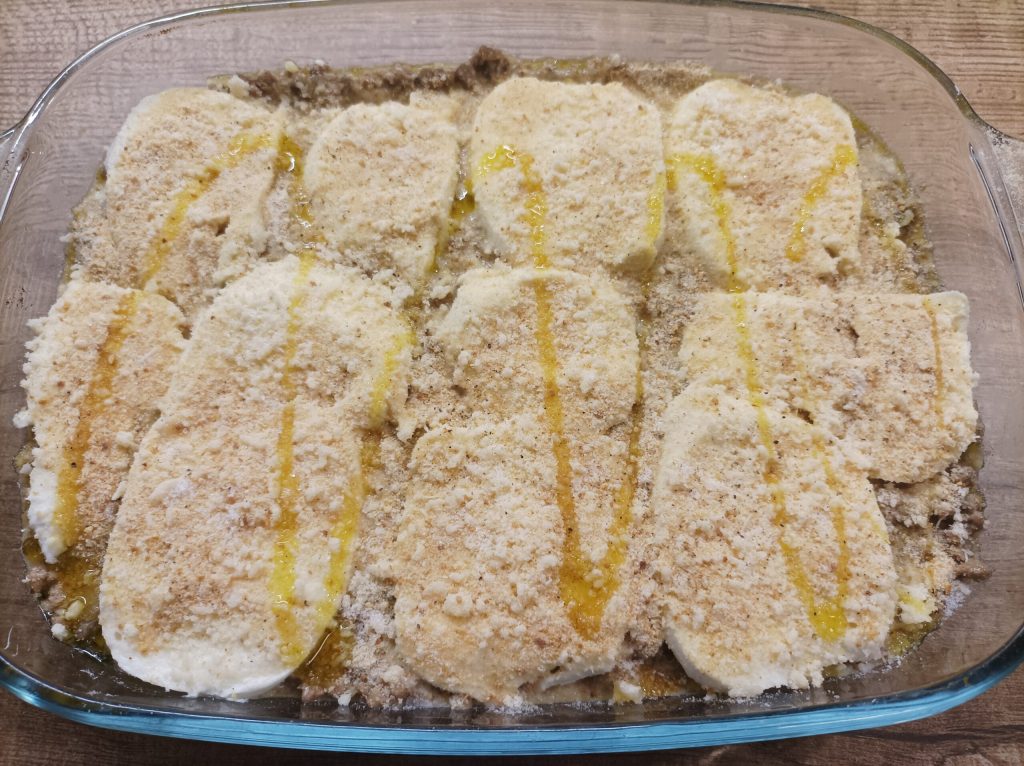 Dann eine Auflaufform nehmen und mit etwas Öl einfetten, das Fleisch einlegen und die Mozzarella in Scheiben darauf verteilen, sodass die gesamte Oberfläche bedeckt ist.