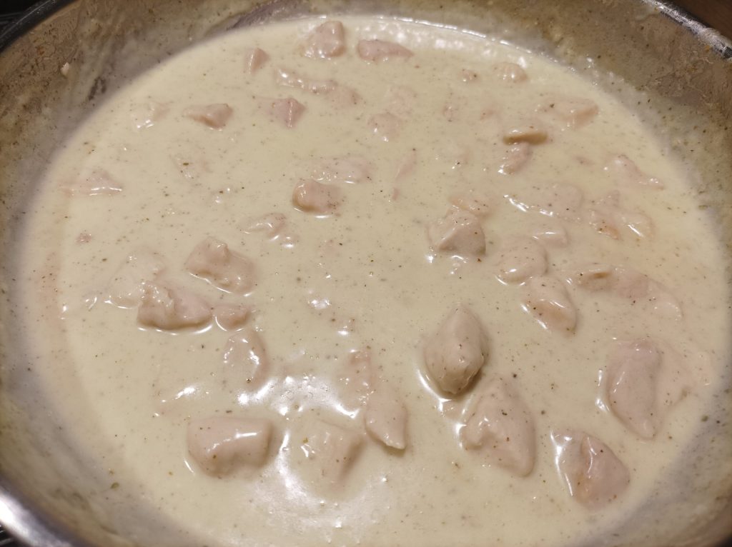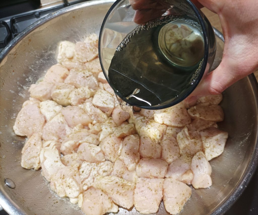 Wenn alle Stücke goldbraun sind, löschen Sie sie mit dem Wein ab, indem Sie die Flamme erhöhen, um ihn verdampfen zu lassen. Danach gießen Sie die Sahne und das Salz hinzu, decken Sie ab und lassen Sie es für etwa 20/25 Minuten eindicken, bis es cremig, aber nicht flüssig ist.