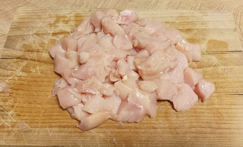 Nehmen Sie die ganze Hähnchenbrust, reinigen Sie sie von Fett und Knochen und schneiden Sie sie in mittelgroße Stücke.