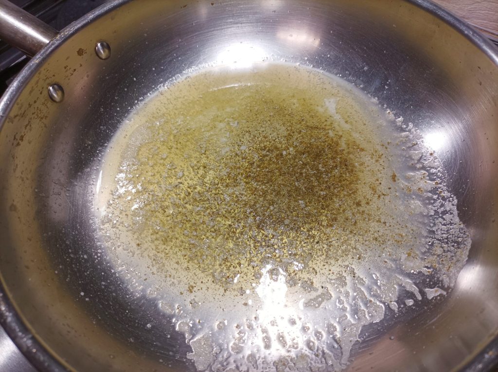 In die Pfanne geben Sie einen Schuss Öl, die Butter und den grünen Pfeffer, den Sie in Körnern oder in Pulverform hinzufügen können. Erhitzen Sie alles und lassen Sie es bei niedriger Flamme schmelzen. Sobald es zu brutzeln beginnt, fügen Sie die eingemehlten Hähnchenbruststücke hinzu.