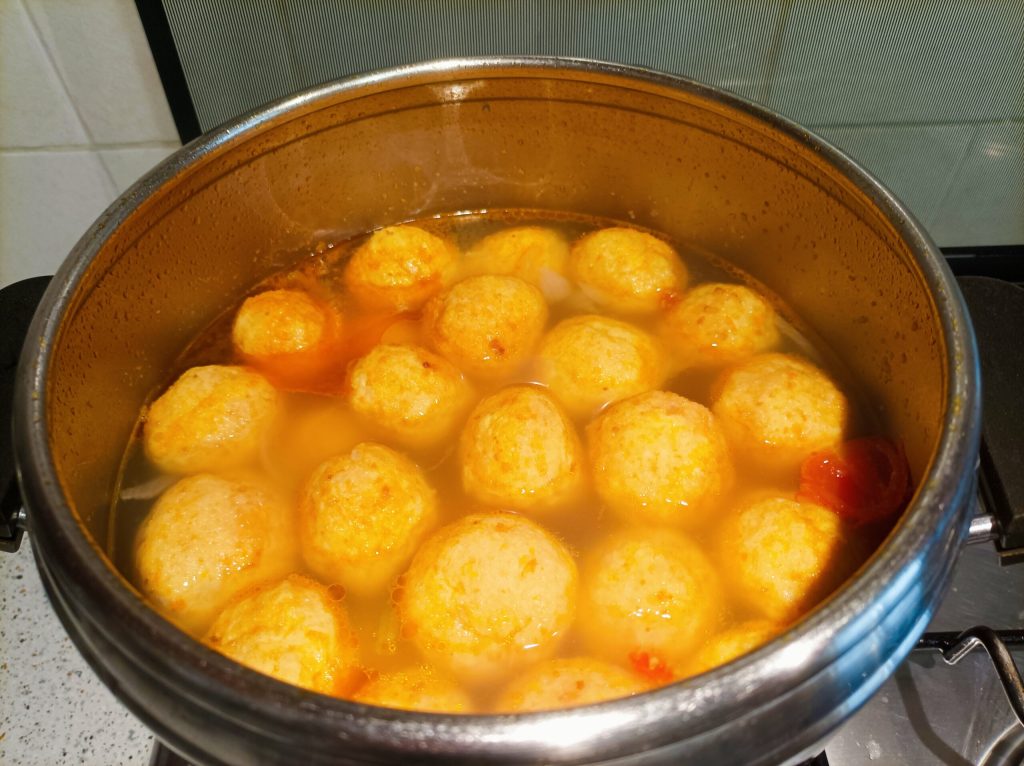 Nach Ende der Kochzeit die Klößchen nehmen und einzeln in die Brühe geben.