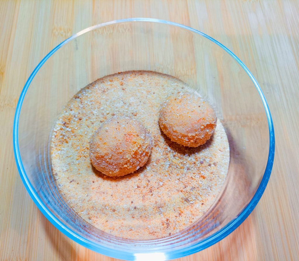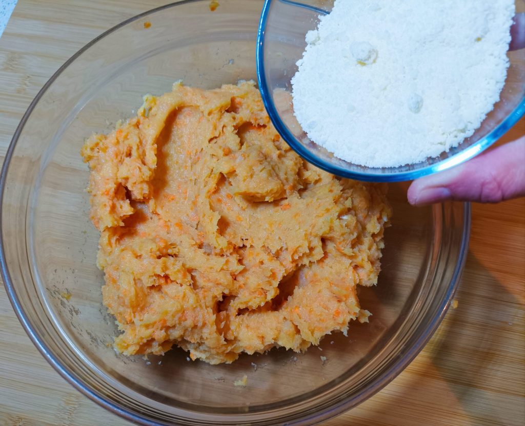 Die Masse in eine Schüssel geben, Parmesan und eine Prise Salz dazugeben.