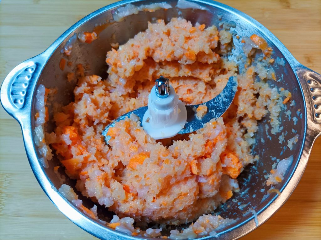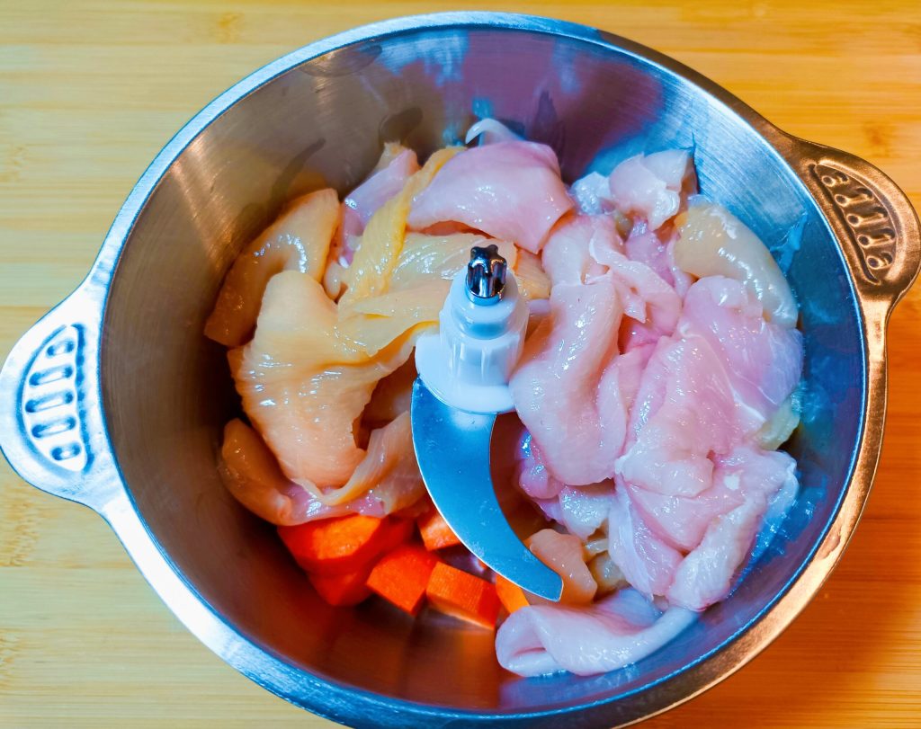 Zerkleinern und zur Hähnchenmasse in die Schüssel geben.